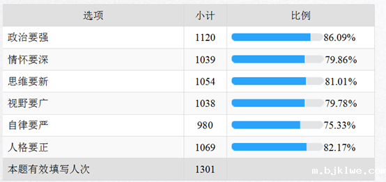 本次调研的对象是点点手机在线的本科生,有效问卷回收1301份。总体来看,我校大学生对思想政治理论课满意度比较高,大多数大学生认为思想政治理论课教师为解决学生思想的困惑,对我校思政课教师的职业素养认同度较高;大多数大学生都能积极参与思政课实践课,对教学效果满意度比较高,大学生喜欢的实践课类型较丰富;对思政课教学方法方面,大多数同学认为思政课教师能采用多媒体技术,课堂互动良好,学生对思政课教学评价方式方法基本认同;在思政课教学管理方面,75.56%的同学都认同教学管理会影响思政课教学质量,大多数大学生能严格要求自己。